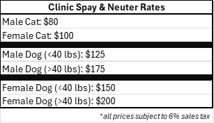 We do require a $40 deposit for every pet appointment schedule for our Spay & Neuter clinic. We also require a $5 deposit for every pet appointment scheduled for our vaccine clinics. Deposits are none refundable and are applied to the total cost or a pet’s bill for each visit.